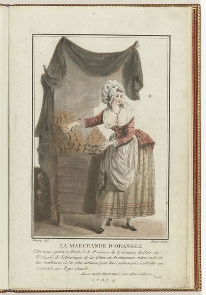 Ludwig Gottlieb Portman created this print, "Two West Frisian Women in Traditional Costume," using etching and watercolor. The composition is structured around two main figures, one seated on a sled, the other standing beside her. The color palette is muted, dominated by soft pinks, blues, and grays, which creates a gentle and almost melancholic mood. Consider how the formal elements of the artwork embody broader cultural dialogues. The traditional costumes, rendered with delicate detail, function as signs of regional identity. Portman uses a combination of precise lines and soft washes of color to articulate the textures of the fabrics, which adds depth and visual interest. The visual arrangement, however, destabilizes fixed social meanings. What does it mean to portray figures in this way? The work exists not merely as a record but as a cultural statement, open to ongoing interpretation and reinterpretation.