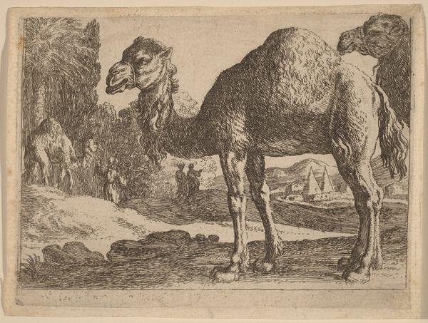 Editor: Here we have "Plate 17: camels, from 'Various animals'," an etching by Stefano della Bella, created sometime between 1636 and 1646. The composition feels really direct, almost like a zoological study, but the tiny figure in the background makes me think there’s more to it. What do you see in this piece? Curator: I see an interesting interplay between the scientific gaze and courtly spectacle. Della Bella was working during a time of burgeoning scientific exploration, and images like this fed a European curiosity about the exotic ‘Other.’ But remember, these prints weren't destined for textbooks. Editor: So, they were more about... entertainment? Curator: Partially. They were luxury goods, often collected by wealthy patrons who used them to signal their sophistication and worldly knowledge. Della Bella worked for the Medici court, so it's highly likely these were destined for an aristocratic audience. How do you think the image of the camel might have functioned within that context? Editor: Hmm… a symbol of power, maybe? Something rare and valuable to possess, even if only as an image? Curator: Exactly. And think about the technique. Etching allowed for a remarkable level of detail, conveying a sense of ‘truth’ about these creatures. Yet, it's a highly constructed image, shaped by European ideas about the Orient and the desire to classify and control the natural world. Editor: That's a different way to look at a picture of a camel! I guess it shows that even simple animal drawings can be tangled up in cultural ideas. Curator: Precisely! Art never exists in a vacuum; it's always a product of its time and place, reflecting social dynamics and power structures. Looking at Della Bella’s work offers insights into the early modern period's fascination with the exotic.