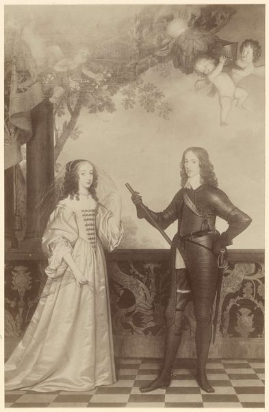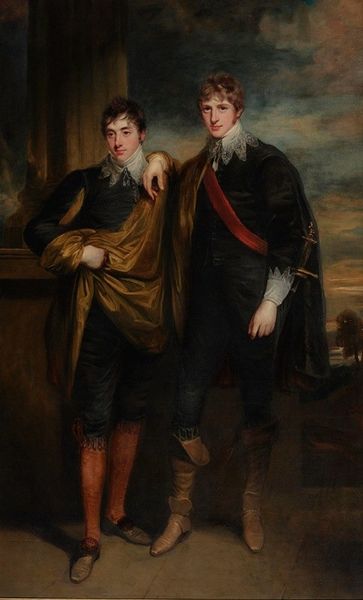 Editor: This is Thomas Gainsborough's "Lords John and Bernard Stuart," painted around 1760-1770, using oil on canvas. The brothers strike rather affected poses. I’m curious – what narratives do you find present in this double portrait beyond its elegant surface? Curator: I see a very intentional performance of masculinity tied to aristocratic power in a changing social landscape. The Stuart brothers' elaborate costumes and relaxed postures are markers of privilege, yes, but they are also performing an ideal. Consider the context. The painting dates to a time of significant political upheaval and shifting class structures. Editor: An ideal, you say? Can you elaborate? Curator: Well, yes. Are they presented as powerful military figures? No. Instead, they embody a softer, more refined aristocratic ideal – one that perhaps masks the brutal realities upon which their privilege was built. We need to consider how power operates in these supposedly "gentle" images. Also note, were the brothers not staunch Royalists who ultimately lost their lives fighting for the monarchy? Editor: That is an interesting point. It suggests the portrait wasn’t just about aesthetic beauty but also served as a complex assertion of their political affiliations and social standing. Curator: Exactly. It reflects how identity, particularly within the aristocracy, was meticulously constructed and performed, as much for themselves as for public consumption, in a society grappling with evolving power dynamics. Perhaps we might view this portrait less as a depiction of simple elegance, but rather an argument in visual form for a very specific kind of identity. Editor: That provides a great point to consider. Thank you.