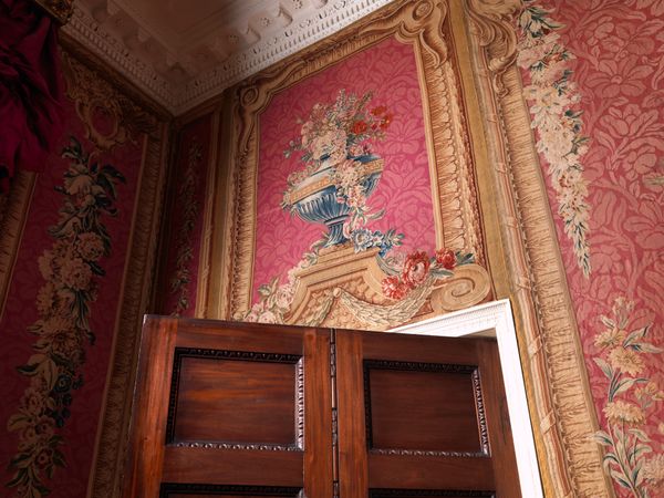 This room was built and furnished for Willem Philip Kops, a merchant and art collector, as an addition to his house at 74 Nieuwe Gracht in Haarlem. With the exception of the original stucco ceiling, the room survives virtually intact. Abraham van der Hart, the city architect of Amsterdam, succeeded in creating a harmonious, classicizing entity, in which all the parts are in tune with one another. He must have been assisted by a specialized firm of upholsterers, which ordered the furnishings and coordinated the installation. The chimneypiece probably came from Italy, the carpet from the Flemish city of Tournai, the furniture from Amsterdam, the silk hangings and upholstery from Lyon in France and the glass chandelier and candelabra from England. The room was most likely used only for formal evening receptions.