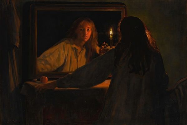 Curator: Looking at Paul Delvaux's 1941 oil on canvas titled "Phases of the Moon II", one can immediately appreciate how he blends elements of academic art with surrealism. Editor: Whoa, instantly I’m getting a cinematic vibe, almost like a still from some artsy, existential horror film. It’s bathed in this muted, unsettling light—all the faces seem frozen, lost in thought, or maybe completely devoid of thought. And is that... a lunar landscape just beyond the doorway? What's that doing there? Curator: The painting deploys some stock symbols that became popular throughout the early 20th century, featuring a seated nude with a peculiar assembly of formally dressed men against an ambiguous landscape. It seems we’ve stumbled upon a modern exploration of genre painting. Editor: Genre painting, huh? That's an incredibly bloodless way to describe something so… odd! The stark contrast between the exposed vulnerability of the woman and the buttoned-up formality of the men really unsettles me, but perhaps there is something exciting happening? It's like a dreamscape dipped in twilight. There is clearly narrative in there, a drama to be explored further. What's the artist trying to say with this bizarre arrangement? Curator: It's likely a reflection of the anxieties present in Europe during the rise of the Second World War, exploring themes of voyeurism and a certain sense of alienation as society began facing unprecedented political transformations and threats. The nudity could symbolize a lack of defense, a stripping bare of the soul or the nation itself. Editor: Maybe. Or maybe it’s about the eternal dance between the exposed self and the masks we wear. But that moon… and those figures lurking. Delvaux is conjuring something primordial, hinting at desires or maybe even dooms we barely understand, let alone control. I find that both chilling and strangely alluring. Curator: He uses the visual language of surrealism to investigate the collective subconscious, and does so, tellingly, amidst growing unrest and devastation during wartime. But his particular surrealism—his deployment of earlier Academic styles of painting—distinguishes his exploration from that of others from the period. Editor: Absolutely, a weird collision of Victorian stuffiness with dream logic and pure weirdness! And it gets you thinking...What lunar phase are we each living in, right now? Heavy thoughts for a Tuesday! Curator: Well said! Thank you, our listeners, for taking the time to unpack the image, social history, and aesthetic power of "Phases of the Moon II". Editor: Don't let the moonlight scare you too much, goodnight.