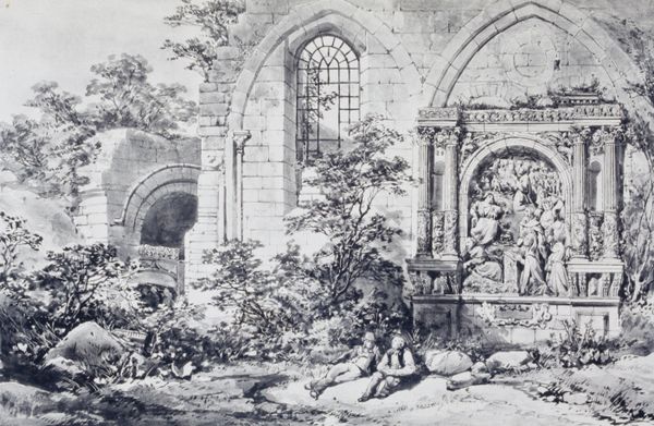 Samuel Prout created 'Scene at Jumièges' with pen and brown wash, capturing a moment in French village life, sometime in the early 19th century. The picturesque quality of this drawing invites us to consider the romanticization of rural life that was fashionable at the time. The Abbey of Jumièges, once a site of religious and political power, is here reduced to a quaint backdrop for the everyday activities of village women. Notice the figures Prout has included: one woman stands, waiting outside a doorway. Her posture, her clothing, suggest the working class. Another woman sits perched above, reading or perhaps gazing out at the landscape. What are their lives like? What stories do these buildings hold? Prout's work allows us to reflect on the intersection of gender, labor, and the allure of the 'pastoral' in a rapidly industrializing world. It’s a reminder of how idyllic scenes often obscure the complexities of lived experience, inviting us to look closer at the people within the landscape.