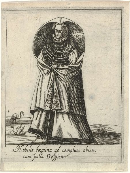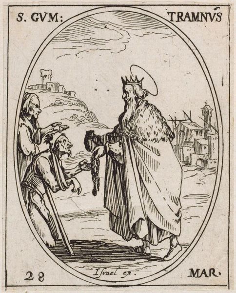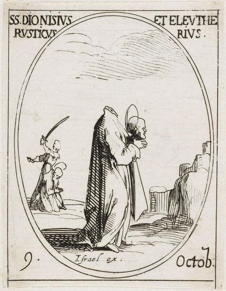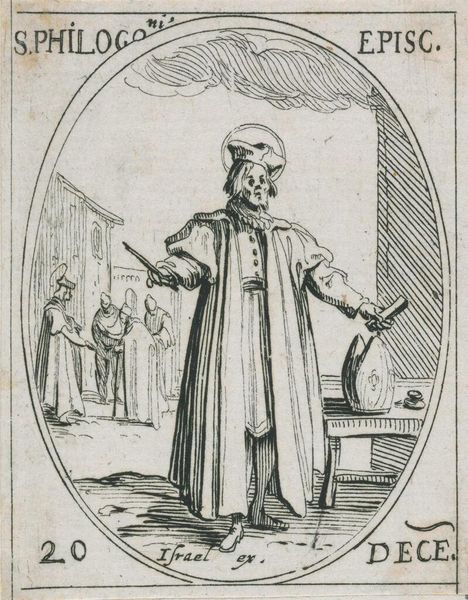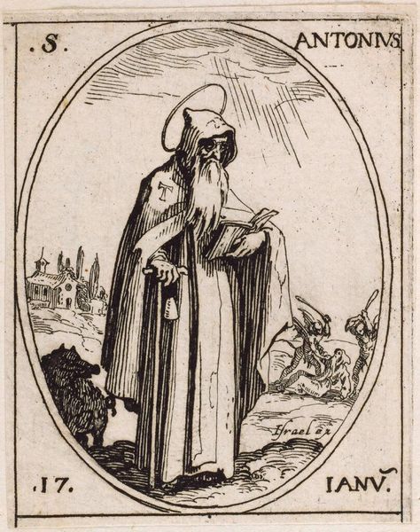 Curator: This is Jacques Callot's "Saint Henry," a small etching. The Saint is beset by demons, yet he stands firm. There's a quiet tension. Editor: The stark contrast between light and shadow really amplifies the drama. I'm struck by how the composition frames Henry as a figure of stability amidst chaos. Curator: Considering Callot's historical context, the image speaks to broader themes of power, piety, and perhaps even resistance in a time of upheaval. The demons are a visual manifestation of inner and outer struggles. Editor: Absolutely. The lines create texture but also serve to represent the invisible forces at work. It's a compelling interplay of form and concept. Curator: Indeed. The details, like the model church he holds, are laden with symbolic meaning about the role of earthly and divine authority. Editor: Agreed. It's a small piece, but the graphic structure is really powerful. Curator: It really allows us to understand Henry's complex position. Editor: Such a well-made image.