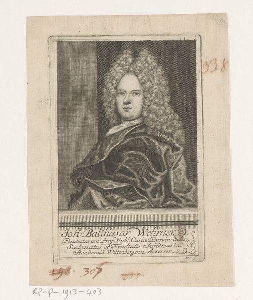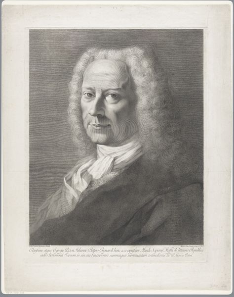 Aert Schouman created this drawing of Johannes Vollevens II with pen in grey ink and brush in grey wash. The tight composition with the oval portrait and the rectangular frame, immediately directs our focus to the face. Schouman masterfully employs a subtle grey wash to model the soft, fleshy features of Vollevens, creating depth and volume within the defined oval. The meticulous rendering of the wig, with its delicate curls, contrasts with the smoother treatment of the face, adding a layer of textural complexity. Consider how the artist uses the formal structure of the portrait to convey meaning. The oval format and the restrained palette speak to the conventions of portraiture during this time, yet the artist's attention to the material qualities of ink and wash pushes beyond mere representation. He invites us to consider how the artwork itself communicates ideas about identity, representation, and the very nature of seeing.