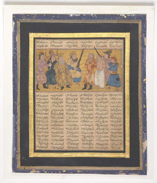 Editor: Here we have "Story of Haftvad," a painting from around 1300, housed at the Minneapolis Institute of Art. The medium is listed as watercolor and ink. It's got such a busy composition, full of figures and text. What do you see in this piece? Curator: From a formalist perspective, I observe a deliberate orchestration of elements that creates a unique visual experience. The composition is neatly structured into horizontal registers of calligraphy framing the imagery, immediately drawing the eye across a clear distinction between text and image. We could analyse it semiotically to try to decode these registers, what would be your take on it? Editor: The calligraphy is almost like a border or frame around the central image, separating and highlighting the art, and the story. The figures, they're clustered in this golden landscape with blue tones. They don't seem to occupy space in a realistic way; they’re arranged for compositional balance instead, like pieces in a design. Curator: Precisely. And consider the artist's employment of colour. Notice the flattening effect – shades do not modulate to create dimension but act in more of a decorative manner, creating symbolic rather than representational impact. Does that flatten the piece overall for you? Editor: It does flatten it somewhat, but there's detail in the figures that grabs my attention; the folds of their robes, their facial features. There’s also this striking contrast between the warm golds and the cooler blues. Curator: The interplay of line, form and colour serves to invite an inquiry of balance and relationships. Do these relationships and construction hint to a broader symbolic understanding, outside its plain viewing? Editor: Possibly! Analyzing the structure gives me so much to consider that I would not have seen at first glance. Curator: Indeed! Appreciating the intrinsic qualities enriches our aesthetic experience.