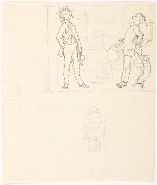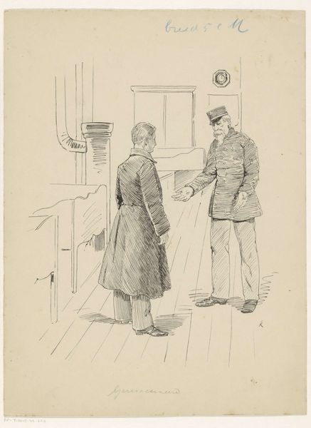 Curator: This drawing is titled "Militair in gesprek met Fourier" and was created by Heinrich M. Krabbé before 1898. It resides here at the Rijksmuseum. What are your initial thoughts? Editor: Stark and immediate, really. The contrasting sizes of the figures, the rawness of the lines… It evokes a rather tense atmosphere. Are they even in the same social sphere, do you think? Curator: Intriguing! The artist uses a fascinating play of lines. The cross-hatching technique to define form, especially in the figures' uniforms and the details in the room. This really brings depth to a simple ink drawing. Consider how line weight alone suggests illumination from a singular source, accentuating folds in the cloth. Editor: And the choice of ink, as a medium. Think about the kind of labour processes available, before even the late 19th century. Someone had to collect it, produce it and trade in it! Even then, working with ink presents unique challenges— its liquidity demands careful preparation and application. So its relative permanency mirrors the militaristic themes depicted? Curator: Precisely! Speaking of themes, consider the subjects. The artist has rendered these characters within a highly structured framework, using the picture plane and even their sartorial arrangement to indicate social station. What strikes you most? Editor: I'm fixated on how the artist renders class. The older figure with his confident posture and fancier embellishments, against the more reserved subordinate figure. It also reads like a very political statement on the role of the military within evolving social dynamics of the late 19th century. A portrait of Dutch power, literally inscribed into its very materiality. Curator: I agree. A rather astute perspective on this detailed tableau of social discourse. It's impressive how much he was able to convey with simple tools. Editor: Absolutely! There's a clear statement about the realities of militarism that's ingrained, inextricably to the materiality of its context. An intimate look into a fraught dynamic, wouldn't you say?