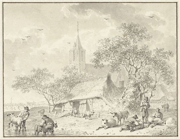 Editor: This is “View of an Encampment of the Army of Willem III near Halle, Flemish Brabant” by Aert Schouman, a drawing in tempera and ink currently held in the Rijksmuseum. I'm struck by how this gray landscape, so delicately rendered, depicts something as inherently disruptive as an army encampment. What catches your eye? Curator: The artist's choice to depict the scene in primarily gray tones is particularly compelling. Notice how the subtle variations in value create depth and form, drawing the eye through the composition. It invites close visual inspection of its technical facility rather than dwelling on narrative specifics. How would you describe the relationship between the foreground and background elements in terms of visual weight? Editor: The foreground feels a bit heavier due to the denser marks and slightly darker values compared to the ethereal quality of the background. Curator: Precisely. This weighting serves to ground the viewer, yet the artist’s consistent employment of visual ambiguity diminishes its ability to depict actual troops in any historical context. It seems to suggest Schouman was much more intrigued with the arrangement of objects on a picture plane than any historical war record. Did anything catch your eye regarding how people or elements arrange themselves? Editor: Well, it's like one triangle formed by that tent and the group of people near it... or the grouping on the bottom. I never thought about that when I saw other encampment landscape artworks. Curator: Indeed. Note how the geometry is used to orchestrate the overall composition of the landscape as a structured visual field for contemplation, more than an image documenting that specific encampment event. Editor: I now perceive how important the visual choices are when the artwork does not intend to reflect what it pretends to depict. It encourages seeing it with a very distinct outlook. Curator: Absolutely, by acknowledging and interrogating these formal strategies, we are empowered to perceive and articulate our own informed experience with the art object and beyond.