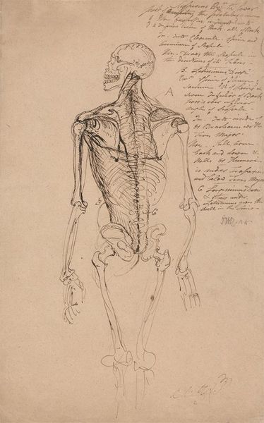 Curator: This arresting drawing is by Washington Allston, titled "Skeleton; Three Male Heads; verso: Profile Head; Perspective Exercise." It's a study, unframed, existing on paper. What are your first thoughts? Editor: Striking. The skeletal figure juxtaposed with the heads seems to suggest a somber reflection on mortality, on the physical structures that constitute us. Curator: Indeed, consider Allston's historical context, deeply intertwined with the Romantic era's fascination with the sublime and the grotesque. His engagement with anatomy reflects a broader societal preoccupation with the body and its limitations. Editor: And we must address the medium. The immediacy of pencil on paper reveals the artist's process. These aren't finished objects, but tools in service of something else, like social or philosophical questions through form. Curator: Absolutely. Allston's work invites dialogue on themes of life, death, and the human condition, challenging us to confront uncomfortable truths. Editor: This piece certainly leaves me contemplating the relationship between material existence and its inevitable decay, a powerful meditation on the physical processes of life.