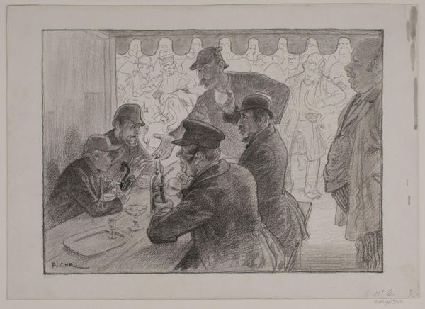 Editor: So, here we have Henri de Toulouse-Lautrec’s “Snobisme,” created around 1897. It's a sketch, and the figures feel really staged, almost satirical. I'm curious – what’s your take on this, considering the time it was made? Curator: The economic conditions surrounding Toulouse-Lautrec shaped his practice and, consequently, the meaning of his work. This piece captures a snapshot of Parisian society in the late 19th century, doesn't it? Who had access to the materials needed to create these sketches? Editor: Right, only certain classes could afford such leisures. The work appears like it was created relatively quickly; how might Lautrec’s methods have impacted who saw or could access the final product? Curator: Lautrec utilized the lithographic process, which was somewhat more accessible for dissemination compared to painting. But how did the subjects and styles represented through such lithographs contribute to reinforcing, or challenging, pre-existing notions of class and social standing? Editor: That's interesting. Because, on one hand, the material was maybe more widely distributed, but it also kind of caricatures a wealthy setting. Did the artistic techniques that he uses affect the meaning as much as subject he represents? Curator: Absolutely. The “how” is integral to the “what.” Lautrec’s rapid style speaks to an efficiency that mass production allows but also underscores his unique skilled labor. These sketches were a type of consumer product – did that influence their reception? Editor: I never thought about how the materials of his time, and methods he used, would ultimately give commentary on those being painted, in terms of access and critique of production. Curator: Considering the conditions surrounding art making certainly enriches one's reading of these fleeting scenes. It underscores art's role as both a reflection of and a participant in its cultural moment.