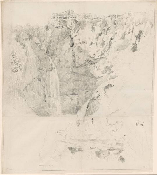 Editor: Here we have Eugène Flandin's charcoal drawing, "Ravijn van de berg Kuh-e Pir Zan in Iran," created sometime between 1843 and 1854. I'm immediately struck by the imposing scale of the mountains, and the lone figure on horseback seems so small in comparison. How do you interpret this work? Curator: The contrast in scale is key. Consider how mountains often represent steadfastness, eternity even. But within the visual language of Orientalism, there's often a subtext of the Western gaze encountering the 'exotic' East. Does the small figure become a symbol of Western dominance, 'conquering' the landscape through observation and artistic representation? Editor: That’s a compelling idea. I hadn't considered the power dynamic at play. So, the landscape isn't just a neutral subject, but a reflection of cultural attitudes? Curator: Precisely! Think about the choice of charcoal. It’s a medium that lends itself to dramatic contrasts, mirroring the perceived contrasts between West and East, civilized and untamed. The ravine itself can symbolize a divide, both literal and metaphorical. What cultural memory does it invoke? Editor: Now that you mention it, the ravine, or the ‘divide’ in the landscape, mirrors how the West perceives a ‘divide’ between their culture and Iranian culture. Thanks for showing how something seemingly neutral, like a landscape drawing, can carry such powerful cultural and psychological weight! Curator: My pleasure! Seeing these familiar Orientalist tropes allows us to look at it more critically and appreciate the symbols Flandin worked with. We can, as a result, understand this image as a rich expression of a particular moment in history.