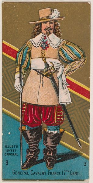 This small chromolithograph from the Kinney Tobacco Company, dating back to around 1888, presents a "Horseman, Greece, B.C." The overall design is strikingly flat, almost a heraldic display. The figure is defined by bold outlines and filled with areas of colour, creating a stylized effect. The armour, rendered in alternating bands of red and blue, adds a vibrant, decorative quality to the warrior's attire. Consider the structural implications of this flatness. The lack of traditional perspective shifts our focus away from depth and realism, instead directing us to appreciate the arrangement of shapes and colours on the surface. The backdrop, with its geometric patterns and floral motifs, further emphasizes the design's surface-oriented aesthetic. The interplay between figure and ground creates a dynamic tension. This work offers a cultural commentary, where the image functions as a signifier, evoking notions of antiquity through a modern, commercial medium.