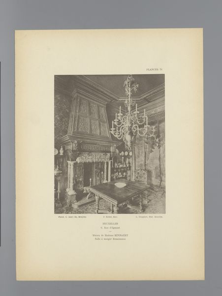 This print by G. Choppinet depicts a room in Charles Tschaggeny’s Brussels home, rendered in monochrome. The room’s design emphasizes verticality, drawing the eye upwards along the fireplace, cabinets, and chandelier. Note how the artist uses light and shadow to define forms, creating a sense of depth and texture within the composition. The careful arrangement of objects, from vases to plates, reflects a cultivated taste, which mirrors the broader intellectual concerns of the Renaissance revival. The picture creates a dialogue between tradition and modernity. The composition invites us to consider how visual language, through elements like light, symmetry, and object placement, constructs meaning. The print serves not just as a record of a space but as a cultural document reflecting values and aesthetic sensibilities.
