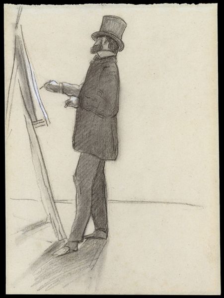 Curator: Here we have "J. Schwartz Massett of London," created in 1841 by Auguste Edouart. It's currently held at the Metropolitan Museum of Art. Editor: It’s striking! The stark black silhouette against the cream paper immediately brings a dramatic, almost theatrical quality to the work. Curator: Indeed. Edouart was a master of silhouette portraits, producing thousands in his lifetime. Consider the materials, the very economy of means: paper, scissors, adhesive. This wasn't an oil painting for the elite; this was a relatively accessible form of portraiture for the burgeoning middle class. Editor: Absolutely. But consider the man depicted. Holding what appears to be sheet music, the gesture of his hands, it feels deeply evocative. The silhouette transforms him into almost a universal figure of artistic contemplation. The image suggests themes of creativity and expression transcending its simple materials. Curator: Precisely! The process dictated a certain aesthetic, almost a standardization. The social function becomes clear: affordable portraiture, documenting individuals in a rapidly changing world. Was it considered 'high art' at the time? Unlikely. Yet, look at it now, hanging in the Met! Editor: I see more than simple documentation. Look at the carefully shaped contours and expressive presentation! Silhouettes held particular symbolic resonance, often used in mourning or to capture a person’s essence without elaborate detail. The blank page suggests absence, but his figure a powerful presence. Curator: But is that not connected to a demand? An industry in image making? It’s through this mode of production and commercial transaction, these methods, and accessibility, that it obtains value both material and aesthetic. Editor: I would agree and still suggest there's a lasting appeal beyond economics or labor. As a viewer, it is powerful. Curator: Fascinating, how these cut paper shapes can provoke so many varied avenues of thoughts! Editor: Truly. What seems like a shadow, has depth and many ways of making connections across history.