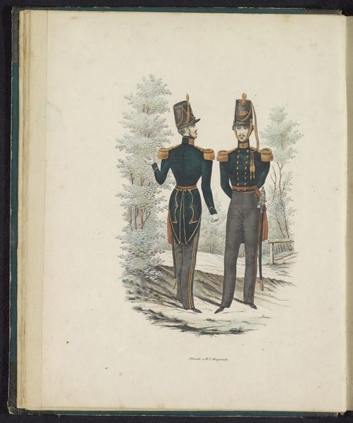 Curator: This watercolour drawing by Louis Salomon Leman, made around 1845, portrays two officers of the marines in full uniform. I find myself immediately struck by the overall effect; it almost looks like a page out of a catalogue or manual. Editor: Yes, the symmetrical composition and the meticulous detail create that impression. The sharp angles and the stiffness of their posture remind me of enforced constraints on 19th-century male identity and its inherent tension between civic duty and personal desire. Curator: That rigidity is further enforced through the potent symbolism of their dress. Note the swords, the belts, the towering hats all meant to convey authority and power. Military attire through the ages serves as a visual language encoding national identity and hierarchical structures. Editor: Absolutely. And Leman is operating within a time of changing definitions of nationhood, particularly concerning naval power and its relationship with colonialism. The marine, standing there in his immaculate finery, becomes a complicated emblem for broader systemic inequities. What about the wider history painting tradition here? Curator: Well, within that tradition, portraits served less to immortalize the individual, but rather, a social type and its relationship with political ideals, particularly, the glory and integrity of naval military life, but I think there's room to examine this prideful image against what we understand today of exploitation during that same period. It reveals contradictions inherent in national self-fashioning. Editor: And that tension gives it an arresting emotional presence. It serves not only to document but also to ask us to consider that even apparently innocent historical portrayals exist inside complex and unequal power structures. It becomes not just about an individual, but about how nations choose to construct and project strength. Curator: Thinking about these images in relation to contemporary discourses has given me fresh eyes, that the weight of history presses down even here. Editor: Agreed. A single visual work encapsulates within it centuries of conflict.