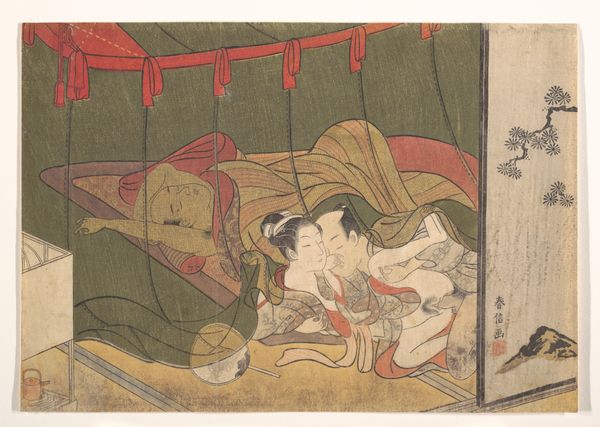 This woodblock print, “Reluctant Leave-taking,” was created by Suzuki Harunobu in the 18th century. Here, we observe two women, one adjusting the other's kimono sash, a poignant moment framed by the soft glow of a paper lantern and delicate floral arrangements. The act of adjusting clothing carries a weight of intimacy. Consider, in medieval depictions of courtly love, the gesture of a knight fastening his lady's cloak; a ritual of protection, a signifier of deep emotional connection. Here, the sash becomes a symbol of attachment, the reluctance to part mirrored in the tender adjustment. We see echoes of Aphrodite tending to Adonis, or even classical images of mothers dressing their children, underscoring themes of care, affection, and the pain of separation. This tender, almost mournful scene taps into our shared reservoir of human experience. The gentle curves and muted colors evoke a sense of melancholy, a reminder of the transience of connection, ever-recurrent, ever-evolving in the theater of life.