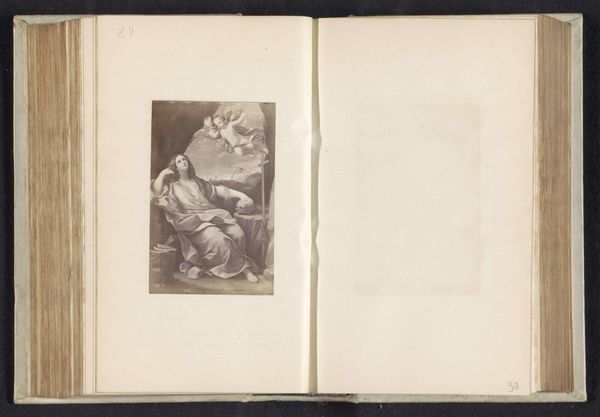 Curator: Oh, hello! Welcome to our gallery. Let’s spend a few minutes examining a photograph titled "Fotoreproductie van een prent naar een schilderij met een hond en twee jachttrofeeën door Edwin Henry Landseer," created before 1874. It's a gelatin-silver print. Editor: Woof. Sorry, but, honestly, the dog looks rather mournful amid the trophies of the hunt. It’s as if the picture sighs. I imagine foggy mornings, the damp chill, the scent of gunpowder clinging to tweed. A sort of somber dignity in defeat, maybe? Curator: Indeed, the pathos is palpable. The composition, though seemingly simple, is quite sophisticated. Notice the arrangement of the game – how their limp forms contrast with the alert posture of the dog. It creates a visual tension that underscores themes of dominance, nature, and mortality. Consider the landscape background, too, enhancing that slightly melancholic air you perceived. Editor: Good eye! I just get this strong sense that even triumph carries a certain weight. Look at how the dog is resting it’s snout. You know the poor pooch has retrieved everything today! It just exudes this really stoic, resigned sort of acceptance... a melancholy. That sort of mood sticks to everything around here. You can almost smell it, you know? I wonder who chose to use a photo instead of a painted depiction? Curator: Interesting. Photography offered a perceived level of realism at the time, while referencing painting. I do like how you mentioned "acceptance," that sentiment connects the subject to broader societal ideas and expectations about domestic animals during the Victorian period, especially sporting dogs. And even today, thinking about our relationship with our pets it raises uncomfortable questions. Editor: Exactly! Curator: So, we see how the image functions on multiple levels, a formal study of composition and a poignant reflection on our relationship with animals and the environment. Thanks for that emotional reading of a hunting picture! Editor: Any time! Glad to point out the sadness that often lingers beneath these images.