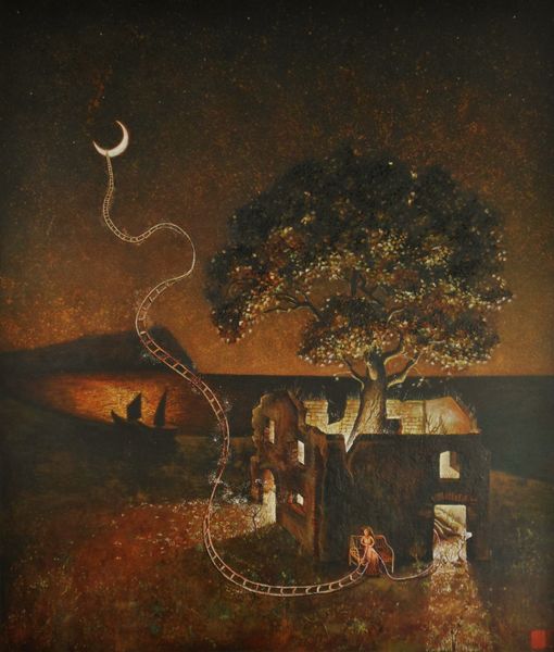 Stefan Caltia made this painting, "The Moon and the Poet," and there's a dreamy, otherworldly quality to it. The way the colors are applied feels very intuitive, almost like a folk tale rendered in paint. I'm really drawn to how Caltia handles the paint; it’s not about perfection but more about capturing a feeling. The greens in the trees are deep and lush, contrasting with the pale, almost ghostly figure of the poet. Look at that poet standing on a bubble! I love how the bubble is rendered, so fragile. And then there are these soft, muted clouds in the sky; they look like thoughts drifting by. This piece reminds me a bit of Chagall, with its whimsical, symbolic imagery. But Caltia brings his own unique sensibility, a kind of quiet magic. Art is all about these echoes and conversations across time, where artists borrow, reinvent, and create something new. It’s never about one fixed meaning but about opening up possibilities.