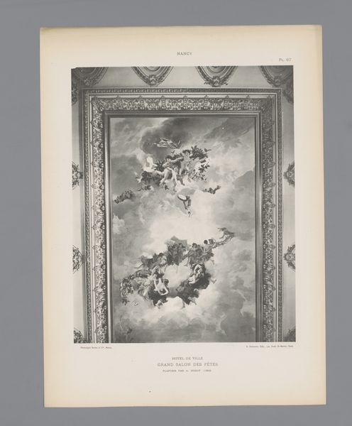 Editor: This is a photograph of "Plafond van de feestzaal in het stadhuis te Nancy," a fresco created before 1896. The photograph is black and white and features a scene with figures in the clouds and in a tree. The overall feeling I get is one of grandeur and maybe even idealized representation. How do you interpret this work, particularly considering its setting in a town hall? Curator: It’s crucial to view this fresco not just as a decorative element, but as a visual assertion of power and ideology. The placement in the town hall—a public space—immediately tells us it’s meant to communicate something to the citizens of Nancy. Considering its creation was prior to 1896, how do you see this imagery playing into the prevailing narratives of nationalism and civic virtue at the time? Editor: Well, with the allegorical figures and classical style, it feels like a direct reference to earlier concepts of citizenship. It definitely idealizes history, but how might that serve a purpose for the people who were viewing it? Curator: Exactly! The use of allegory would evoke specific virtues and historical connections. In whose eyes, and at whose expense? The neoclassical style, common in academic art of the period, further legitimizes these messages, linking the present to a glorified past. The figures floating above could represent abstract concepts of justice or prosperity that are being ‘granted’ to the town, perhaps justifying the current political structures. What underlying assumptions about gender and power do you detect here? Editor: I guess the female figures in the clouds might represent the abstract concepts, like you said, while maybe the figures in the tree are...the people of Nancy looking to those abstractions? It still seems a little hierarchical. Curator: Precisely. It’s important to remember that art rarely exists in a vacuum. Understanding who commissioned it, the social context, and the power dynamics at play help us critically analyze what stories this ceiling is really trying to tell. What do you take away from viewing it with those questions in mind? Editor: I see how a piece like this, which at first seems beautiful and harmless, actually reinforces a specific worldview about power. I hadn't thought so critically about it initially.