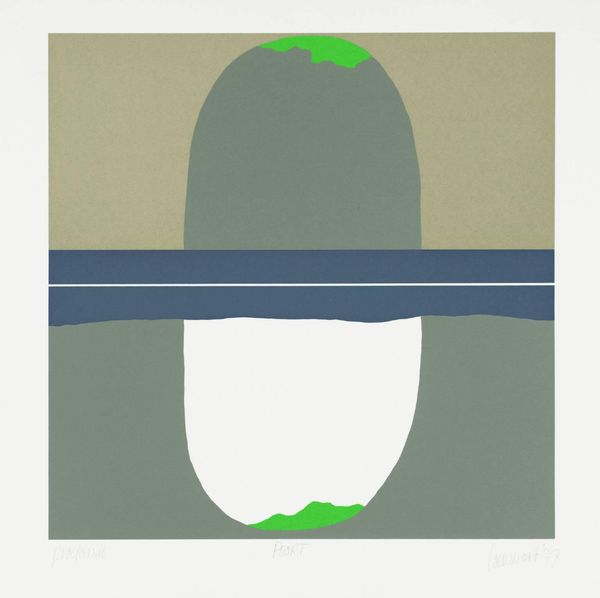 Curator: Hans Landsaat's serigraph, "Island III," presents a study in simple shapes and color fields. My immediate impression is one of starkness, almost loneliness. Editor: The isolation feels palpable, doesn’t it? I see this island, bisected as it is, as a commentary on environmental divides, the exposed and the submerged, the seen and unseen consequences of our actions. Curator: Note how Landsaat uses the horizontal line to create a distinct separation, almost a barrier, challenging our perception of depth and space. The blue form is suggestive of a geological mass, yet its flatness denies any illusion of three-dimensionality. Editor: And that vibrant green at the peak—is it hope? Or perhaps a marker of the few resources left? It feels deliberate, a sharp contrast to the muted blues and browns, highlighting ecological vulnerability. Curator: Indeed. The composition’s minimalist nature invites contemplation on the fundamental elements of form, challenging us to consider how these shapes interact on a purely visual level. Editor: Ultimately, I think it's a powerful statement on fragility and the precarious balance between land and water, demanding we reflect on our place within that ecosystem.