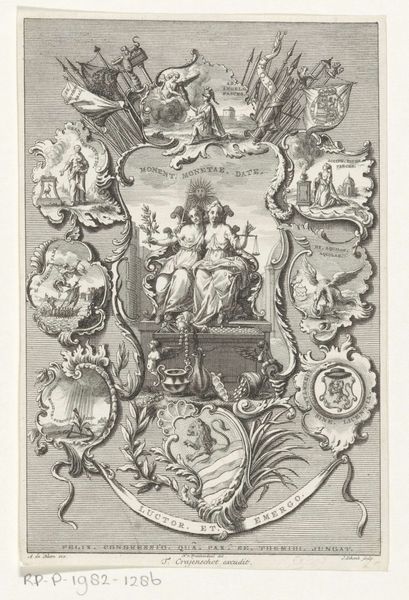 This print at the Rijksmuseum, made anonymously with etching, presents a highly structured display of power and iconography. The composition is densely packed with military trophies, flags, and allegorical figures surrounding a central portrait. The artist used sharp, precise lines to define each object, creating a textured surface that invites the eye to explore. The semiotic structure of the image is clear: the central portrait suggests leadership, framed by symbols of victory and authority. The arrangement of objects—swords, shields, and angelic figures—functions as signs of strength and divine endorsement. This creates a visual argument about the legitimacy and might of the figure depicted. The rigorous detail and orderly arrangement of the weaponry and figures function aesthetically, but they also underline a cultural discourse around power. Its complex visual language invites ongoing examination.