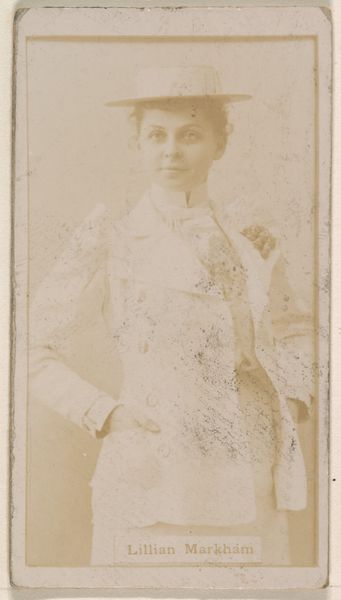 Curator: Here we have a promotional portrait from around 1890. It’s from a series of actresses, distributed by Kinney Brothers to advertise Sweet Caporal Cigarettes. The sitter is May L. Smith. Editor: She appears remarkably serene, almost ethereally posed amidst what seems to be an ocean of tulle. It projects a fragile sensibility, quite contrary to what one would expect of cigarette promotion. Curator: Precisely. Note the tonal range, mainly hues close together on the color wheel. This lends a distinctive visual cohesion to the photograph. Consider too how the delicate details in her dress mirror those in her up-do. Editor: What I find most interesting is its use within commercial imagery—it prompts important questions about representation and performance during a transitional era for women. A celebrity endorsing tobacco complicates and undermines this facade of bourgeois womanhood. It encourages dialogue on the dynamics of labour, gender, and consumer culture during the late 19th century. Curator: A valid reading. But do you think we might also consider her gaze? It has an introspective depth that is mirrored in the sharp rendering of her features. It's this kind of internal compositional integrity which speaks most profoundly. Editor: But this compositional "integrity," is carefully curated and directly feeds into the commodification of this woman's identity. How can we ignore these economic and social pressures? Curator: Point taken, but that framework tends to dissolve her individuality, don’t you think? Even amidst these capitalist objectives, a personal agency perseveres. Editor: Perhaps. All the more reason why a sustained awareness of these intertwined forces seems important for our contemporary context. Curator: An invaluable discussion! Thank you for giving such an impassioned perspective. Editor: Thank you for guiding us in the discussion on her portrait!