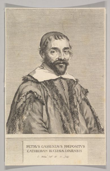 Curator: Here we have Claude Mellan’s portrait of Pierre Gassendi, housed right here at the Harvard Art Museums. Editor: It's striking how the figure emerges from a background of stark, parallel lines. There's almost a sense of... discomfort? Curator: Mellan, active in the 17th century, was known for engravings precisely like this. The process involves carving into a metal plate. It's an incredibly meticulous and laborious process. Editor: And look at the rendering of Gassendi's fur-lined robe. The texture and detail suggest a real fascination with surface and material, don't you think? Curator: Absolutely. The image speaks to the social and intellectual standing of Gassendi at the time, and how Mellan's work helped to solidify that identity. Editor: The political implications of representation during this period were immense; imagery was power. I find myself thinking about the role of institutions like Harvard in preserving and exhibiting these kinds of works. Curator: It makes you consider the layers of interpretation and the ongoing dialogue between art, history, and audience. Editor: Indeed, it's a reminder of how much these old images can still tell us today.