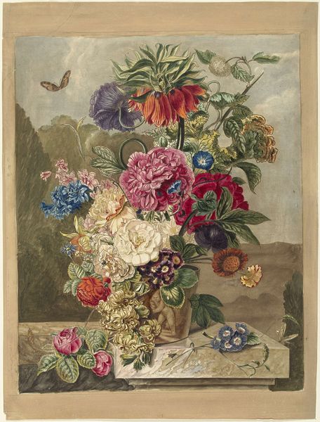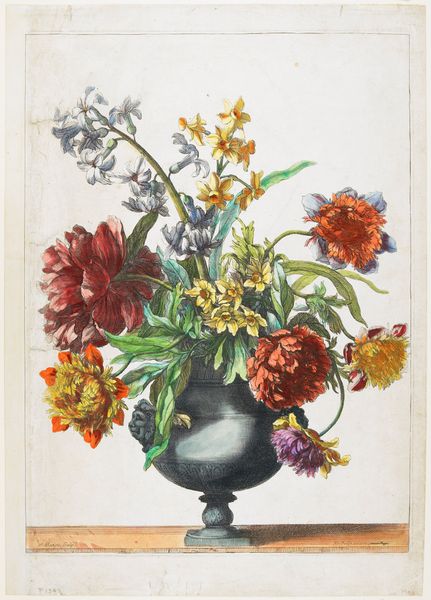 The demand for prints of vases with flowers must have been enormous in the 17th century. They were produced in every known printmaking process, including mezzotint. This technique developed only after 1650 and was praised because it approximated the art of painting so closely. This, incidentally, did not apply to the colours: the ones here were added separately by hand.
