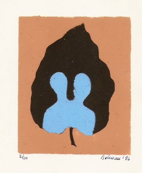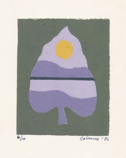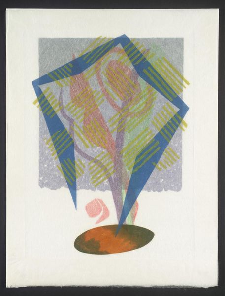 Editor: We’re looking at “A Perfumed Gale of the Autumn Is All That's Left in My Memory (from the Autumn series),” a print by Vasile Dobrian. It features a stylized leaf, composed of geometric shapes in yellow, blue, and pink. What's most striking to me is how the artist manages to evoke a sense of autumn using such an abstract form. What stands out to you? Curator: The composition is particularly compelling. Observe how the artist has layered the geometric forms. The yellow leaf acts as the foundational structure. Notice the interplay between the cooler blue and the warmer pink shapes, intersecting across the space to establish depth. How does the orientation of these forms impact your perception of movement within the picture plane? Editor: I see what you mean! The diagonal lines of the blue shape create a sense of movement, like the wind you would expect in the autumn. But it also feels very contained by the static nature of the leaf shape, as if autumn is being reduced to pure form. Curator: Precisely. It avoids narrative associations and emotional expression in favour of formal arrangements. What does the application of colour tell you about the artist's intentions here? Are we looking at a purely representational depiction of form, or is it something more? Editor: The colours feel intentional, perhaps to indicate a change in temperature or to distinguish shapes for clarity, without creating realistic shadows. I'm wondering what kind of message this piece as a whole is sending about abstraction. Curator: By distilling the essence of autumn into a structural arrangement, Dobrian elevates the formal qualities of shape and colour above literal representation. The artwork creates an open space for consideration, allowing the viewer to explore its materiality through this structured composition. Editor: This makes me think differently about how abstraction can be rooted in reality. I will never look at Autumn the same way again!