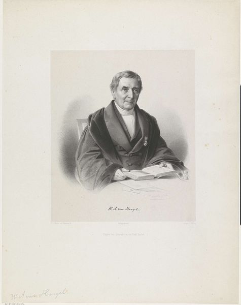 Editor: Here we have a drawing entitled "Portret van een onbekende man, mogelijk de heer Jorissen," made with graphite sometime between 1851 and 1857, attributed to Johann Peter Berghaus. I'm struck by how detailed the clothing is compared to the rather plain face of the sitter. What do you make of this portrait? Curator: For me, the interest lies precisely in those material contrasts. Notice how Berghaus renders the jacket with painstaking detail – the weave, the buttons, the fall of the fabric – a celebration of textile production and perhaps even consumer culture emerging at that time. While the face remains rather generic, almost a template. Editor: So you are saying it’s less about the individual and more about what he represents? Curator: Exactly! The labor invested in producing the sitter’s clothing speaks volumes about societal values and the emerging middle class. Look closely at how the graphite is applied, mimicking the texture and weight of cloth. What does this suggest about the role of the artist as a skilled craftsman, rather than solely a genius? Editor: That's a good point, and the drawing looks almost like a lithograph, blurring the line between handmade and mechanically reproduced images. Curator: Precisely! Think about the role of portraiture in this period. Was it merely about capturing likeness, or was it also a display of status, achievable through carefully crafted garments? The book he holds becomes another prop, a signifier of literacy and social standing, produced and consumed. Editor: It's amazing how much a simple portrait can reveal when you focus on the materials and context surrounding its creation. Curator: Indeed. Shifting our focus from the individual to the means of production unlocks fascinating insights into the values embedded within even the seemingly straightforward artwork. It also invites us to question what aspects of labour were valued or made visible in such art.