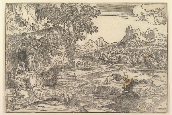 Editor: So, this is Lucas Gassel’s "Landscape with Saint Jerome," dating from somewhere between 1555 and 1575. It's currently hanging at The Met, and it's a tempera print using the intaglio and engraving techniques. What immediately grabs me is the incredibly detailed landscape – almost dreamlike in its layered composition. How do you interpret this work? Curator: It's interesting, isn’t it? A sort of meditative escape unfolds within that dense detail. To me, Gassel is conjuring a very personal retreat here. Saint Jerome, traditionally depicted in austere settings, is plopped down into this almost bizarrely cheerful, even bustling landscape. There’s a push and pull. Where do *you* feel your eye goes first? Is it drawn to the saint or does that wild landscape steal the show? Editor: I think my eye initially wanders all over the landscape. It's so meticulously rendered! It almost feels like a stage set with the Saint tucked away almost out of sight and at the margins. Is Gassel commenting on the role of the individual in the face of nature's grandeur? Curator: Precisely! The scale is intriguing, yes? We have this expansive, almost theatrical stage of nature overwhelming a lone, pensive figure. Consider too the technique; engraving lends itself to sharp lines, stark contrasts. It's almost as if Gassel is suggesting a tension. Jerome's spiritual contemplation *needs* that stark contrast to exist. The chaos amplifies the peace, perhaps? I wonder how that contrasts to what you think this work speaks to you? Editor: That's a really beautiful perspective. Initially, I got lost in the details, but now I appreciate the relationship between Saint Jerome and the landscape itself, and how one depends on the other. It's been fun "zooming out" of my own initial focus. Curator: Precisely, and that initial draw *is* a valuable insight itself. It reveals something important to *you* which might even teach me something as well. Cheers to seeing something in the details.