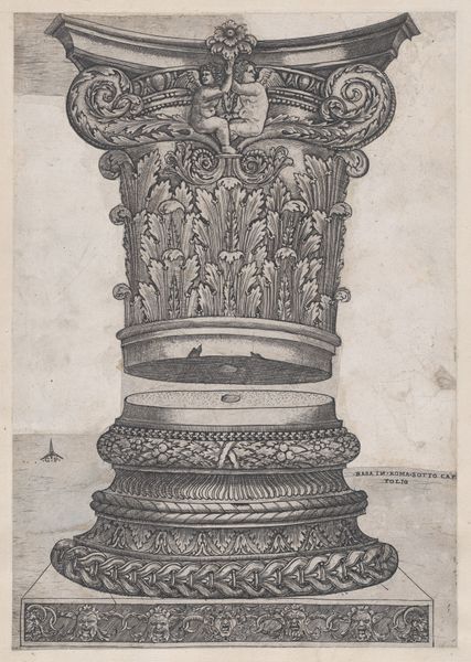 This engraving by Monogrammist G.A. & the Caltrop depicts a capital adorned with potent symbols: ram heads and grotesque masks. The ram, an ancient symbol of virility and power, appears here in a classical context, reminiscent of its use in Greco-Roman art. Yet, the addition of theatrical masks transforms this familiar symbol into something more complex. We see these masks, echoing the theatrical traditions of antiquity, employed to ward off evil and evoke strong emotional responses. Consider how similar masks appear in ancient Greek theaters, exaggerating human emotions for dramatic effect. The grotesque visages tap into primal fears and anxieties, a visual language that transcends time. The masks remind us of the human capacity for both creation and destruction. These symbols resonate with our deepest subconscious, a potent reminder of the cyclical nature of history. The symbols resurface, each time carrying echoes of the past, yet adapting to the present, forever evolving in their meaning.