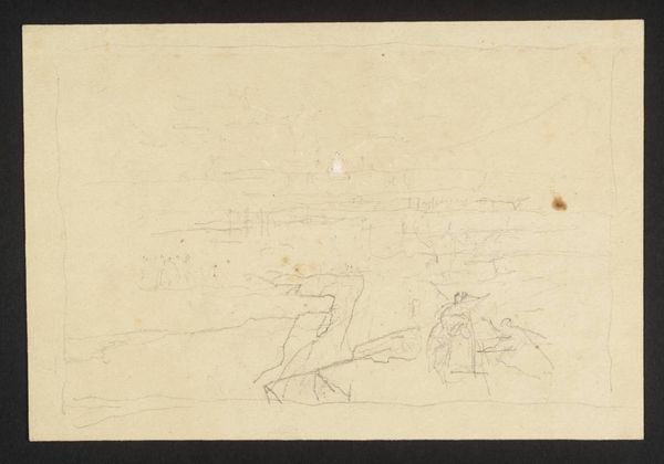 Johannes Tavenraat created this drawing, Kerk te Doorwerth en figuren op een landweg bij Heelsum, with graphite on paper. At first glance, the composition divides into two distinct registers: an elevated landscape scene and a closer view of Doorwerth church among rooftops. The upper scene features a cluster of figures seated beneath a tree, sketched with loose lines and minimal detail, evoking a casual, pastoral feel. The landscape is rendered with broad, horizontal strokes that suggest depth and distance. Below, the church and village roofs are drawn with slightly firmer lines, offering a clearer, more intimate perspective. The drawing plays with the formal contrast between expansive vistas and concentrated architectural details. This contrast invites us to consider how Tavenraat juxtaposes the public and the private, the natural and the built, reflecting contemporary interests in landscape, national identity, and the picturesque. Ultimately, the loose, sketch-like quality suggests a study, an exploration of form and perspective rather than a finished statement.
