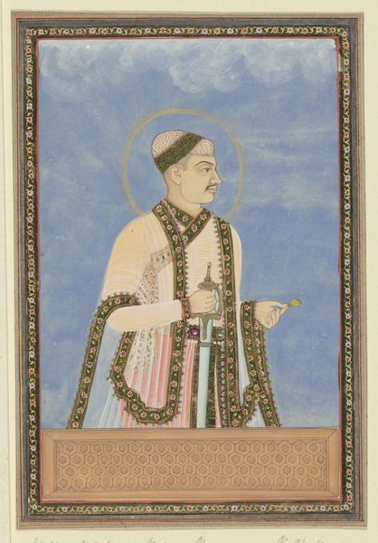 Editor: Here we have "Portret van Musa Khan, die een page van Sultan Abdullah is geweest; na Neknam-Khan heeft hij gediend als legeraanvoerder van Karnatak," circa 1686. It's an anonymous watercolor painting currently residing in the Rijksmuseum. There’s something about the flatness of the figure against that pastel background that really catches my eye. What historical narratives do you see at play here? Curator: It's a fascinating piece precisely because it offers insight into the social structures of the time, doesn't it? We see Musa Khan defined by his service – first as a page, then a military leader. This wasn’t simply a personal portrait; it was a statement of social standing, deeply embedded within the political landscape of the Karnatak region. Editor: So, it’s less about the individual and more about his role within those power structures? Curator: Exactly. Think about the patronage system. Who commissioned this? Why? Likely someone wanting to broadcast Musa Khan’s allegiance and perhaps even their own connection to his influence. How might the imagery contribute to constructing that message? The attire, the weapons, even the framing - each carefully considered to convey power. Editor: I hadn't considered the framing device itself as part of that communication. It feels almost like a stage. Curator: Precisely! Art in this period was performative; a visual stage setting to communicate social and political realities. Consider how such portraits functioned within the networks of power – who saw them, where were they displayed, and what messages were intended for those viewers? Editor: It definitely gives me a new perspective on these seemingly straightforward portraits. Thanks for elaborating on this context, seeing this now feels less like observing and more like eavesdropping. Curator: Indeed. The public role of art is rarely passive; instead it actively helps to construct the socio-political realities of its time, and we, in turn, learn a bit about that moment in history.
