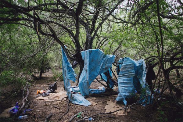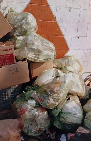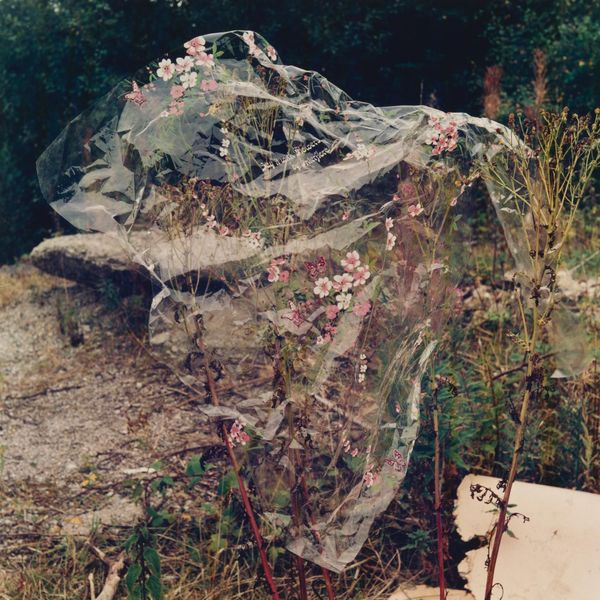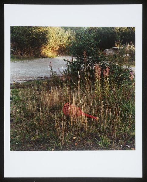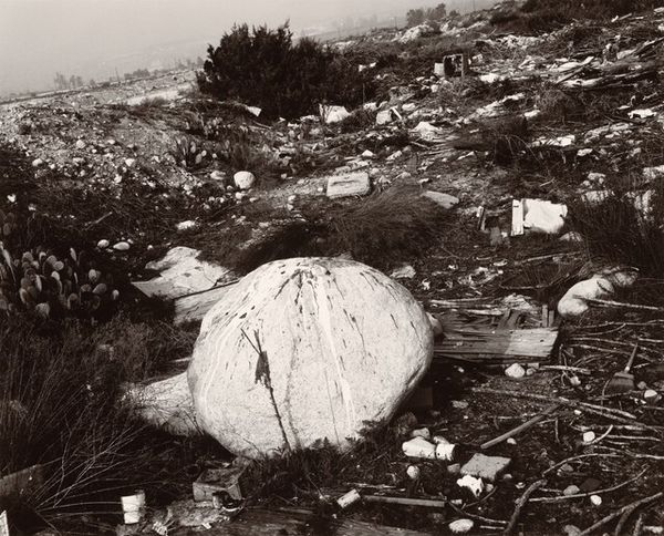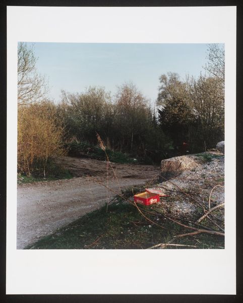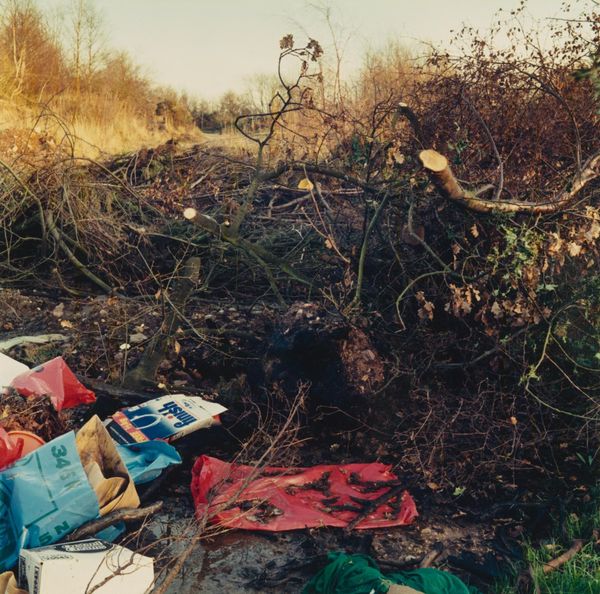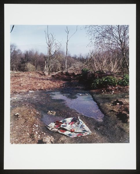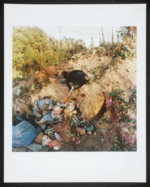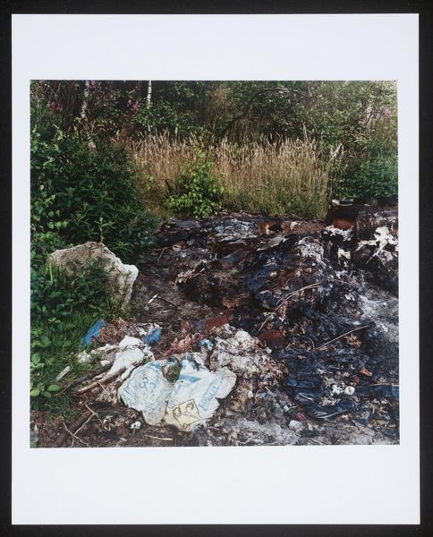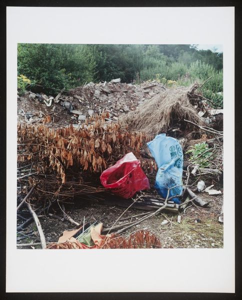 Curator: Keith Arnatt's photograph, "Miss Grace's Lane", presents an unsettling image of discarded refuse. It's a compact piece, roughly 25 by 20 centimeters. Editor: It strikes me as rather bleak, a poignant depiction of human impact on the landscape. The red stain on the refuse bag is particularly jarring. Curator: It's part of a larger body of work where Arnatt explored the boundaries between art and documentation, focusing on everyday materials and their social implications. Editor: The lane itself becomes a symbol, perhaps, of lost innocence or disregarded beauty, defiled by the unthinking actions of people. The red is like a wound. Curator: The materials are crucial here. Arnatt used photography to elevate the mundane, drawing attention to waste, consumption, and their lasting effects on our surroundings. Editor: Yes, he transformed discarded objects into symbols of environmental decay and human disregard, making us consider the weight of our actions. Curator: It leaves you considering the life cycle of the materials and what traces of labor and production are present. Editor: Definitely a somber image, resonating with a potent blend of loss and urgent warning. Curator: A crucial point well observed.