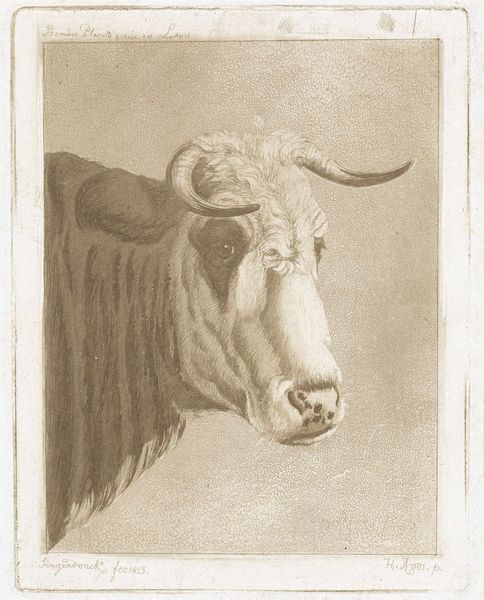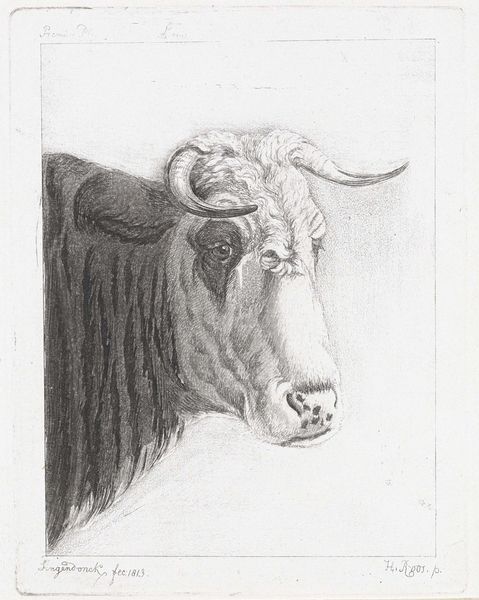 Curator: This drawing is entitled "Ossenkop, naar links," and was created sometime between 1780 and 1851 by Pieter Janson. The medium appears to be primarily pencil on paper. Editor: Immediately striking is the stark, almost confrontational gaze of the bull. The heavy pencil lines really emphasize its muscularity. I can almost feel the rough texture of its coat. Curator: It is quite striking how Janson’s realism lends this bovine an almost individualized identity, especially when situated within larger social and political themes of agrarian labor and shifting societal relationships with animals at the time. What might this image tell us about power structures embedded in agricultural practices? Editor: Good point! And considering the labor involved: think about the artisanal knowledge and the physicality required to capture such detail with just a pencil. How much reliance there was on easily-obtained local materials like graphite and paper for artistic training. The texture almost echoes the animal's skin, drawing a direct link between maker and subject. Curator: I agree. Looking at it through the lens of cultural studies, what does this drawing of a bull signify? Does it evoke themes of masculinity, strength, or even vulnerability, depending on the viewer's background and beliefs? How does gender play into its creation and reception? Editor: It raises so many questions about our relationship with nature too. The work, in a very basic sense, reflects humanity’s effort to catalogue the earth and its nonhuman inhabitants through portable, easily-archived imagery. We need to consider this artwork within the frame of objecthood—pencil, paper, sketch—and the networks of human exchange that enabled their making and trade. Curator: It is precisely that layered interpretation that keeps these works relevant. It reminds us that even seemingly straightforward depictions are deeply embedded in complex webs of meaning and power. Editor: And also serves as an example of beautiful, honest, unpretentious use of the most elemental artistic media, grounded in observation and the quotidian.