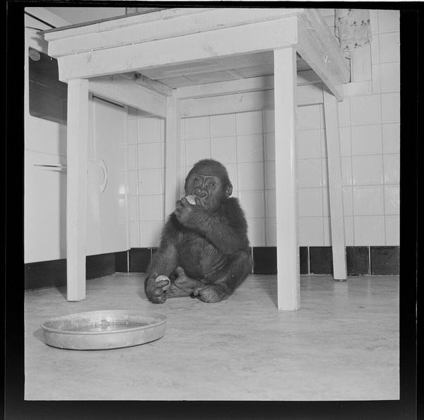 Editor: So, here's a quirky little photograph from the Harvard Art Museums, "Untitled (man putting shorts on chimp)" by Jack Gould. It’s a small print, and I find the scene rather… unsettling. What's your take? Curator: Unsettling is a good word for it! I feel a certain… displacement when I look at it. We're seeing a power dynamic, of course, but also something more intimate. The chimp's gaze, that's where the real story lies, I think. What do *you* see in its eyes? Editor: It looks rather resigned, maybe? I hadn't really considered it that deeply. Thanks for your thoughts! Curator: My pleasure. Art is a process of discovery, isn't it?