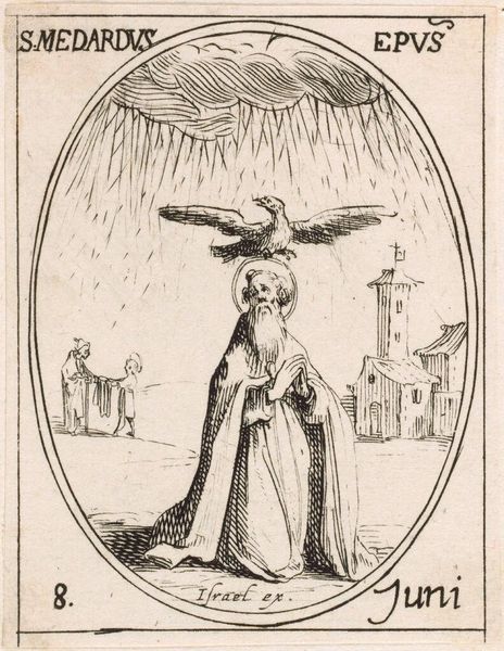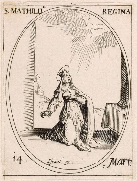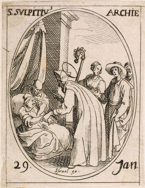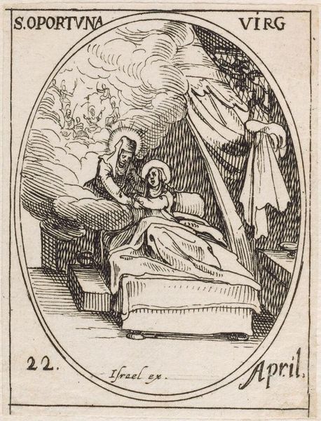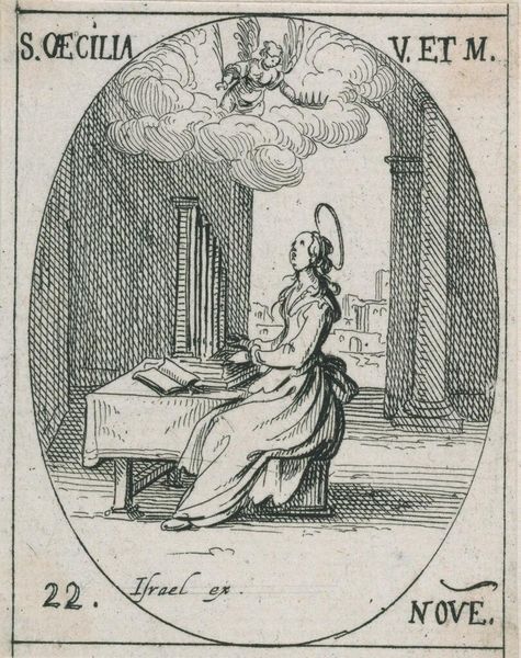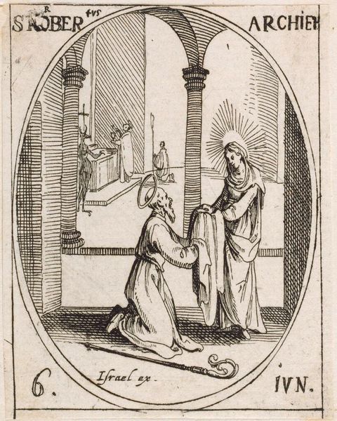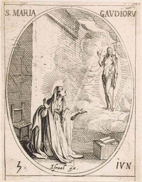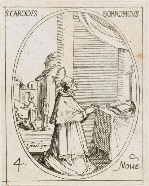 Editor: Here we have Jacques Callot’s small etching, "Saint Bonaventure." The piece feels so serene, almost like a whispered prayer. What do you make of this intimate scene? Curator: It's a miniature world, isn't it? Callot uses the etching technique to create a feeling of both intimacy and grandeur. I see Saint Bonaventure, a cardinal, receiving divine inspiration. The angel seems to emerge from the ether, offering guidance. The use of line, so precise, creates a sense of almost otherworldly clarity. Does it speak to you of anything in particular? Editor: The angel definitely grabs my attention. The interaction between Saint Bonaventure and the angel is interesting. I’ve learned so much! Curator: Indeed. And Callot, through his mastery, invites us to witness this moment, too.