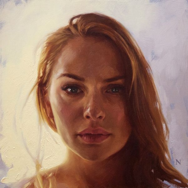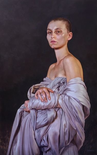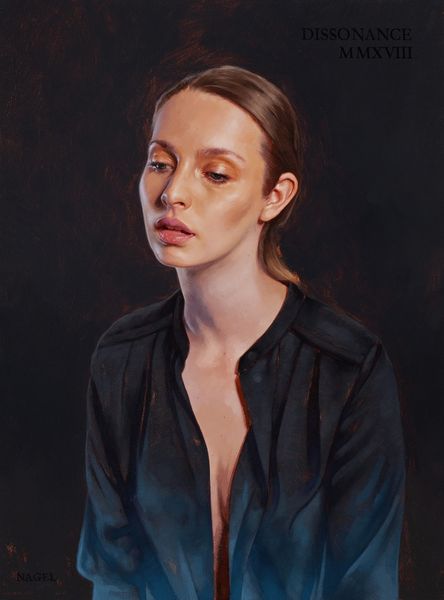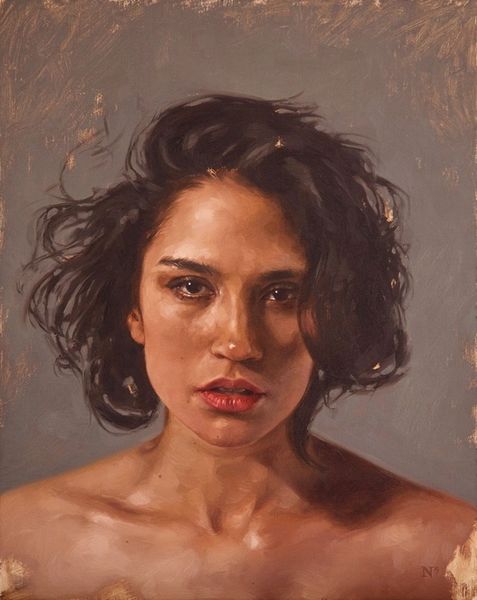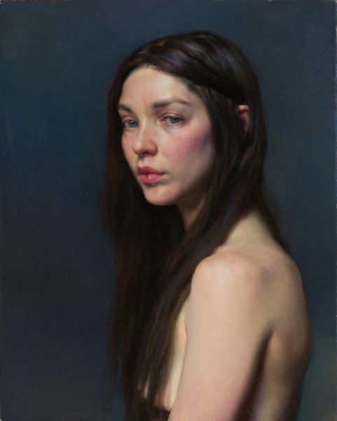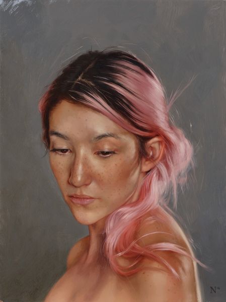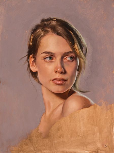 Editor: This is "Portrait of Paige" by Aaron Nagel, painted in 2016 with oil paint. The neutral colors create this incredibly calm, almost serene feeling. How do you interpret this work? Curator: Beyond the immediate impression of serenity, I see a deliberate commentary on the objectification of the female gaze in portraiture. Nagel subverts this by stripping away typical signifiers of identity—ornamentation, elaborate clothing, context. What we're left with is a raw, almost clinical presentation of the subject. How do you feel that contributes to the dialogue about female representation? Editor: It’s interesting, I didn’t consider that. The bare shoulders and the simple hairstyle made me think of classical portraits, like a modern-day Venus. Does that tie into the discussion of objectification at all? Curator: Precisely. By referencing classical ideals of beauty, Nagel implicates the viewer in perpetuating these historically-constructed standards. The contemporary piercing, however, complicates this, adding a layer of modern individuality. What does that small, deliberate detail tell us about the agency of the subject within this artistic framework? Editor: I guess it’s like a subtle act of resistance. Like Paige is asserting her own identity within this idealized representation. Curator: Yes. And consider the role of the artist, typically male, in shaping these portrayals. Nagel, by inviting this dialogue, is actively critiquing the power dynamics inherent in the artistic process itself. What can contemporary art do to resist this objectification? Editor: It's eye-opening to consider how this seemingly simple portrait engages with such complex issues of representation and power. I'll definitely look at portraits differently now! Curator: Absolutely, seeing art as a dialogue, not a monologue, enriches our understanding and challenges the status quo. Art is more than what is shown, it is also about what is not directly seen or felt.