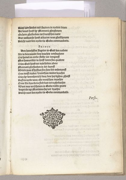 Curator: This image presents the 'Display of the Eyes of Christ (Diest), 1561.' It is an engraving and woodcut from the Northern Renaissance. I see the image embedded within a book page. Editor: Yes, the visual contrasts very starkly with the text block that accompanies it! It’s like two separate visual systems in dialogue with one another. What jumps out at you from this combination of printing methods? Curator: Notice how the anonymous artist has used the black lines to delineate forms with precision. The lozenge shape encloses the cross, plants, ribbons, and coats-of-arms, focusing our attention inwards and establishing compositional balance. We can examine this shape, both containing the primary symbolic forms of Christianity while contrasting against the looser lines of the printing block’s text. Editor: The rigid shape emphasizes those important iconographic motifs; is there something to the heraldry present that reflects it? Curator: Good eye. Heraldry was a status-laden language during the Renaissance, and the coats of arms may carry very local or personal references not currently decipherable. But focusing on its formal inclusion, its strategic placement is important to notice first: balancing in that top right and bottom left corners and thus strengthening the print’s borders and shape. I wonder, what does this do to one's viewing of it? Editor: Hmm…that contrast really intensifies the almost devotional feeling that it initially evoked. It frames and enhances this image in a similar way to medieval illuminated manuscripts that contrast very dramatically in their visual components. Curator: Precisely! Focusing our viewing upon that symbolic framing, this visual emphasis on shape makes us then turn to the symbolic relationships happening in the interior. And indeed, the inclusion of various heraldic signs reflects on status and power, further cementing the visual and historical components to that effect. Editor: Thank you, I now feel that I’ve considered those interior components in relation. This visual strategy that allows one form to frame another emphasizes that powerful interplay. Curator: And hopefully provided tools for future examinations into visual composition!