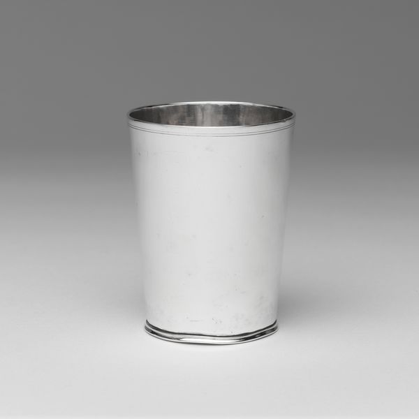This is a silver beaker made by Gregg, Hayden and Company, sometime between 1829 and 1840. At first glance, its sleek, cylindrical form might seem purely functional, but let's consider its place in early 19th century America. Objects like this beaker speak to the burgeoning middle class of the Jacksonian era. Silver was becoming more accessible, a signifier of upward mobility and domestic refinement. We can imagine this beaker gracing a middle-class table, perhaps used for a child's daily milk. Yet, the very material it's made of – silver – connects it to histories of extraction, labor, and trade, often involving exploitation. The beaker embodies the contradictions of its time: aspirations for equality and the harsh realities of inequality, the desire for progress intertwined with the legacies of the past. It asks us to reflect on the stories objects can tell and the values we pour into them.