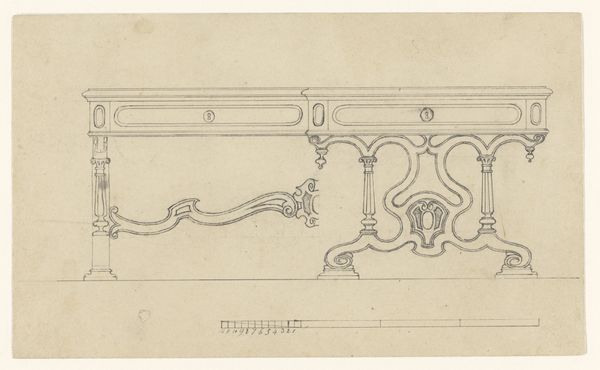 Editor: Here we have "Ontwerp voor een tafel, met een gecombineerd voor- en zijaanzicht," a design for a table with combined front and side views, created around 1865-1870 by Joseph Kusterer, using pencil and ink on paper. It looks like a preparatory sketch for a rather ornate table. What catches your eye about it? Curator: What intrigues me is considering its context: mid-19th century Europe. This table isn’t just a piece of furniture, it reflects broader societal trends. What do you think someone commissioning such a table at that time might be trying to communicate? Editor: Perhaps wealth or status? That level of detail seems expensive and time-consuming. Curator: Precisely! Think about the rising middle class during the Industrial Revolution. They sought ways to display their newfound prosperity and emulate the aristocracy. Objects like these tables, meticulously designed and crafted, served as symbols of social aspiration. How does that knowledge impact how you see the artwork now? Editor: It makes me think about the democratization of design. Today, something like this might be mass-produced, whereas back then, it represented bespoke craftsmanship. It wasn’t just a table; it was a statement. Curator: Exactly. The design reflects prevailing tastes and ideologies and became objects to show cultural capital. The question for today's viewers is what type of message they see within those period tastes. Editor: It's fascinating to see how even a simple table design can reveal so much about the values of a particular era. Curator: And how it also speaks to how tastes, power and money influence art. Food for thought indeed.