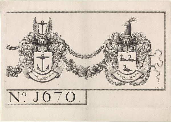 Editor: This intricate engraving from 1688-1689 by Romeyn de Hooghe, titled "Wapens van 'Willem Fabricius' en 'Salomon van Echten'," presents two crowned coats of arms with crossed axes. I find the detail incredible; each crest is unique. How might we interpret the social meaning embedded within this print, given the context of its creation? Curator: Indeed, its visual density tells us much about its function and intended audience. These aren't merely decorative flourishes. Consider that in the late 17th century, heraldry played a significant role in defining status and legitimacy within the Dutch Republic's power structures. This print, reproduced in multiples, aimed to publicly assert the importance of these families. Editor: So, it was a form of early public relations? How did prints like these circulate? Curator: Precisely! Prints served as a vital medium for disseminating information and shaping public opinion. This print would likely have been commissioned by the families themselves for distribution amongst their peers, clients, and political allies, to broadcast their lineage and, by extension, their authority. The prominent date, 1688-89, falls within the era of the Glorious Revolution in England. Can you speculate on why these families might want to underscore their significance during such a period of upheaval? Editor: Perhaps as a reminder of stability and established power during uncertain times? Showing that their families, with their historical claim of relevance, should still be considered during times of potential government restructuring? Curator: Excellent point. Think about the messages conveyed through the visual symbols within each crest – crosses, fleurs-de-lis, lobsters. Each element reinforces a particular narrative of lineage, occupation, and perhaps even political allegiance. The coats of arms themselves acted as logos or brand names. Editor: It’s fascinating to see how art functioned within the political landscape. The level of thought and intention behind something seemingly decorative is striking. Curator: Precisely. Analyzing the cultural history helps reveal layers of meaning often overlooked, and emphasizes the critical public role that art, including prints such as this, served in the 17th century. I encourage you to dig more into this area.