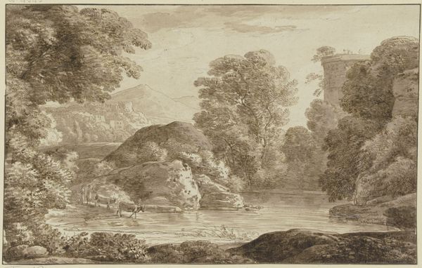 Curator: Before us we have "Baumreiche Landschaft mit Schafherde," or "Tree-rich Landscape with Flock of Sheep" by Franz Kobell. Editor: It's so serene. The graded washes of ink create a dreamy effect, and the composition, framing the distant hills with those large trees, draws me right in. Curator: Exactly! It's landscape in the romantic style. It attempts to express human-kind's humbled position in the grand scheme of nature. But let’s consider Kobell himself. He comes from a family of painters known for landscape and animals; an artist aristocracy almost! This scene fits neatly into the expectations for art patrons of the time. Editor: While understanding Kobell's lineage contextualizes this piece, let’s return to the drawing itself. Observe the precision! Each tree seems individualized with distinct canopies achieved through varied hatching and stippling. Notice how light falls selectively to create an organic sense of volume in the leaves. Curator: A sophisticated command of the medium, for sure, which facilitated popularity. These idyllic pastoral scenes served a social purpose. They evoked feelings about land and ownership amid changing socio-economic forces. Who commissioned it, and for what setting, reveals the painting’s ideological underpinnings. Editor: Perhaps. But I still read a universal appeal. Consider the winding stream guiding your gaze, this gentle movement. The details—the tiny figures resting by the water's edge. All of this leads towards a vanishing point on the horizon creating spatial harmony, and conveying an unmediated experience of the landscape. Curator: But who is granted this "unmediated experience?" This romantic framing naturalizes existing social relations. How are notions of class and landownership subtly encoded through such imagery? That is what speaks to me. Editor: It is intriguing how divergent analyses can be equally illuminating. Both contextual history and formal qualities shape our aesthetic and social experiences when contemplating artwork. Curator: Agreed. It is through these multiple perspectives that we can gain a more complex understanding of works from the past.