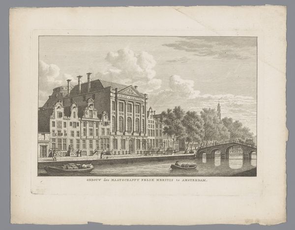 Editor: This engraving, "Stadsgezicht met Kanselarij te Leeuwarden," by Carel Frederik Bendorp, dates from around 1790. It's a cityscape with very detailed architecture. The mood feels calm, almost serene. What kind of stories do you think it tells through its imagery? Curator: It speaks volumes about the civic pride and burgeoning sense of order during the rise of Neoclassicism. Observe how the Chancery, the 'Kanselarij,' dominates the scene; it’s a temple of governance, meticulously rendered to inspire confidence. Consider the choice of engraving itself - a medium lending itself to precise reproduction, disseminating ideals of reason and enlightened rule throughout society. Editor: I notice people in the foreground, almost like genre painting within the cityscape. Is there anything we can interpret from that? Curator: Precisely! The figures, seemingly incidental, subtly reinforce the new social order. What kind of message do you believe these ordinary citizens might convey? Their activities, balanced between work and leisure, point towards a well-regulated society enjoying the fruits of its progress. The figures near the water and on the bridge, can be interpreted as engagement with civil life through travel, trade, and lawmaking. The people near the front walking dogs evoke privilege. Do you feel this idyllic imagery portrays an authentic sense of 18th-century Dutch society, or more of a symbolic representation? Editor: I see your point. I think there is some romanticization happening in this image. Maybe there are even a few symbols that escape me? Curator: Consider how the architectural setting might signify authority, but the soft treatment of nature and citizenry introduces harmony. That juxtaposition itself is ripe for discussion. Editor: That's fascinating! I will be looking closer to architectural symbols from now on! Curator: Indeed, artistic depictions provide insights on values!