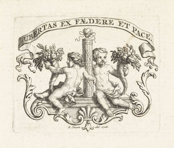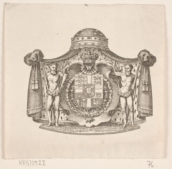Curator: Take a look at this intriguing print titled "Wapen van Denemarken," or "Coat of Arms of Denmark," dating from 1751 to 1816. It's the work of Reinier Vinkeles, rendered through delicate engraving. What strikes you first about it? Editor: Honestly, it feels a bit like stepping back into a time capsule, all elegant lines and archaic symbolism. There's a certain formality that feels very much of its period. Are those...sea gods flanking the shield? Curator: Precisely! They're wild men, mythical figures often used in heraldry to symbolize strength and untamed nature. Vinkeles has presented them almost like classical statues, adding another layer of complexity. Note the lettering forming a perfect circle, *Amstelaedami consulatus regius Daniae,* Amsterdam, Royal Consulate of Denmark. Editor: It's a potent symbol, really. Amsterdam, as a major port city, undoubtedly played a significant role in Denmark’s trading networks. It makes you wonder about the visual strategies at play here. How are they constructing authority and connection? Curator: Absolutely. The choice of a circular format lends itself well to official seals and emblems used throughout the Danish kingdom and diplomatic contexts. Its production during the mid to late 18th century tells us about how national identities were visually asserted through graphic means. Editor: And think about the elephant pendant! How far does that imagery go? What was Denmark’s interest in visually affiliating with something like that at that moment? Curator: A great question that goes straight into social, cultural and political contexts. The Order of the Elephant is the highest order of knighthood in Denmark. It gives the artwork another very strong layer of aristocratic and political power. Editor: Looking at the technical aspect, I am fascinated by how Vinkeles managed such intricacy. You can nearly feel the sharpness of the engraver's tool as you observe. What kind of effect does that meticulous precision do you think? Curator: The medium's inherent ability to capture minute details reinforces the authority vested in these symbols of state, ensuring clear communication to all viewers of their status. Vinkeles' engraving here elevates what may have otherwise remained mere ornamentation. Editor: Well, I've learned more about coats of arms than I thought I would today! Curator: And hopefully you’ve developed an appreciation of what heraldry tells us about cultural expression and power.
