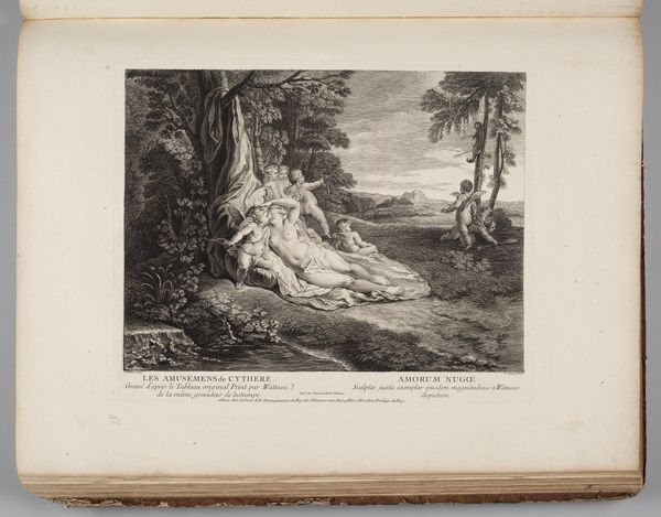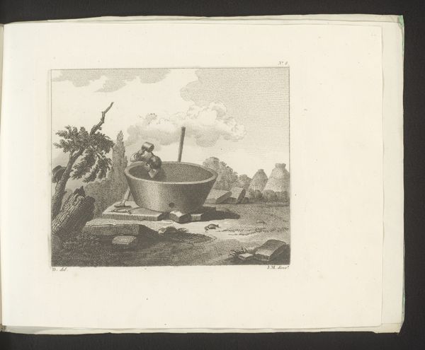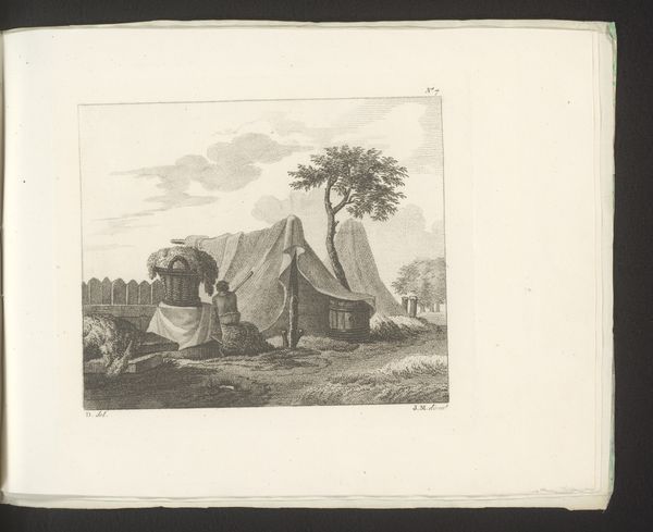 Curator: This is a fascinating piece: a print titled "Titelprent voor een reeks tekenvoorbeelden," or "Title Print for a Series of Drawing Examples," dating from around 1800 to 1825. It is currently held at the Rijksmuseum. Editor: Immediately I see this sort of collapsing world, everything weighed down… I guess by that immense white cloth or tarp in the middle there. It draws my eye, especially juxtaposed with that delicate line work everywhere else. It’s mostly etching, but there's also engraving evident upon closer examination. Curator: Indeed. The contrast in textures speaks to the layered meanings, or rather potential. A simple dwelling depicted in great detail is partially veiled as though posing for a photograph with elements suggesting industry in the rural setting. Editor: Exactly, how deliberate are these material choices here in constructing a scene. That drapery looks like it's obscuring laborers in their context, beside the materials they're working on. So, what's hidden? Curator: Perhaps, but it is an invitation to a method. This doorway curtain isn’t merely screening off, but beckoning one to unveil or, more aptly, _learn_ the skills that would uncover an idyllic setting beneath. The composition offers up familiar Romantic symbols; the cottage representing domesticity, a stream for freedom, etc. What seems weighed down is in reality expectant. Editor: But note how the materials create this contrast—a heavy, manufactured-looking white cloth against the roughly thatched roof. That's the core. And consider the social reality implied by that heavy fabric – production, trade, access. That’s the focus rather than idyllic life, maybe? It’s less pastoral fantasy than study of its underpinnings. Curator: It may also serve as allegory… something to hide. In art, concealment often is intended to direct an audience in a given trajectory… It also calls us toward the academic impulse of revealing what underlies a concept or form through line and composition. Editor: It's funny. I arrived thinking of the material obscuring laborers and what gets obscured by such prints generally and leave here also appreciating how material itself in prints offers insights into access and education. Curator: Very true, how seeing informs becoming… until our own viewpoint gets, ever so politely, re-formed.