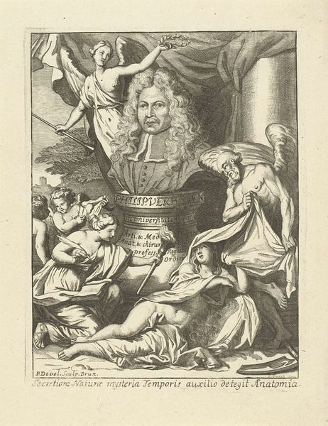 Editor: This is a print of "Christopher Steiger" by Claude Drevet. The textures, especially in the drapery and the subject's wig, are incredible. What catches your eye in terms of composition and technique? Curator: The linear precision, evident in the hatching and cross-hatching, creates a rich tonal range. Observe how the artist manipulates line weight to define form and establish a hierarchy of visual interest. Note also the subtle gradations, achieved purely through variations in line density. Editor: So, it's all about the lines and how they create form? Curator: Precisely. The print's visual impact relies on the artist’s mastery of line as both a descriptive and expressive tool. The arrangement of shapes, the balance of light and shadow—all stem from this fundamental element. What do you make of the figure’s placement within the frame? Editor: I see how the framing really emphasizes the figure's importance through its symmetry and detail. Thank you for pointing out the line work; it's something I'll definitely pay more attention to. Curator: Indeed. A close reading of form can reveal a great deal.