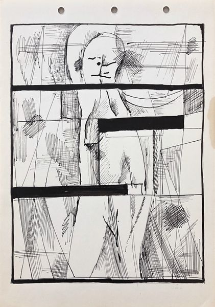 Maria Bozoky made "Kolner Serie #9" with ink on paper. This artwork emerges from a historical context marked by war and displacement, which significantly shaped Bozoky’s life and artistic expression. Through the lens of identity, we see the intertwined themes of motherhood and confinement. The drawing presents a dichotomy of a woman’s face in the foreground and a woman holding a child in what seems to be a window. These figures appear trapped within harsh lines, hinting at emotional and physical boundaries. Bozoky might be exploring the traditional representations of women and motherhood, pushing against conventional narratives by portraying a more complex, constrained reality. This image resonates with personal and societal themes of protection and isolation. The figures seem to question the safety and freedom within the domestic sphere, inviting us to consider the emotional weight of these roles.