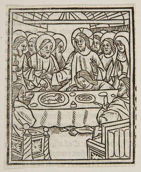 Curator: There's a raw, almost urgent quality to this woodcut, a 'Last Supper' by an anonymous artist, housed here at the Harvard Art Museums. Editor: It feels strangely intimate for such a monumental subject, doesn't it? The stark black and white lines give it a directness, a sense of immediacy. Curator: Yes, the visual language simplifies the narrative, making it universally accessible. Note the lamb on the table—a powerful symbol, prefiguring Christ's sacrifice. Editor: But why a lamb, specifically? Was this intended for a particular audience, a specific cultural context where the lamb held special significance? Curator: Precisely! The lamb connects deeply to Passover traditions, underscoring the Jewish roots of Christianity and the theme of redemption. The image taps into centuries of collective memory. Editor: It's fascinating how such a simple composition can carry so much weight. It makes you wonder about the role of this image in its time and how it circulated. Curator: Indeed. It's a potent reminder of the enduring power of symbols to shape beliefs and understanding. Editor: A lasting image, provoking questions still relevant today.