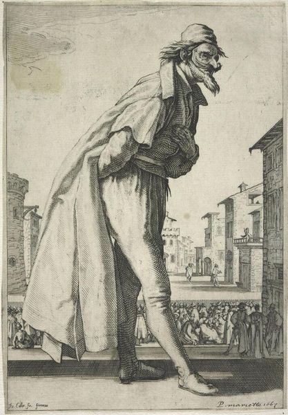 Curator: This is Jacques Callot's etching, "Gentleman Wrapped in a Fur-Trimmed Cloak." Editor: Immediately, I notice the subject’s somewhat affected air—the elaborate hat, the jaunty smirk. It speaks to a particular performance of masculinity. Curator: Callot was a master of etching, and the detail here is striking. Look at the fur trim, each strand rendered with incredible precision. It speaks to the material excess of the era. Editor: And beyond the subject’s obvious class privilege, I'm interested in how Callot situates him within this landscape. It implies a certain ownership, doesn’t it? A control over the space he occupies. Curator: The etching process itself was labor-intensive, involving skilled artisans. The print becomes a commodity, circulating representations of status. Editor: Absolutely, and through Callot's rendering, we can question the values of that society. We see both the allure and perhaps the absurdity of such displays. Curator: Precisely. The very act of creating and consuming these images was deeply embedded in the economic and social structures of the time. Editor: It’s a small image that contains a multitude of societal reflections.